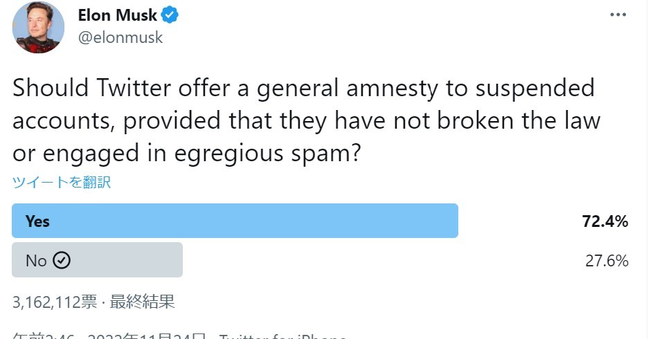 Twitterのイーロン・マスクCEOは、「来週から凍結アカウントの恩赦を始める」とツイートした。「恩赦」をすべきか否かという投票で7割以上がすべきに投じたためとしている。