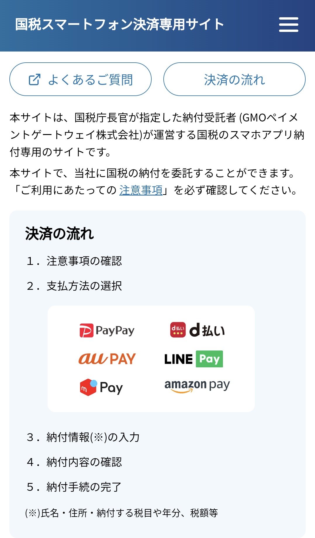 12月1日、国税の“Pay払い”がスタートした。国税をスマートフォンの決済サービスで支払える。「PayPay」「d払い」「au PAY」「LINE Pay」「メルペイ」「Amazon Pay」の6種類が利用できる。