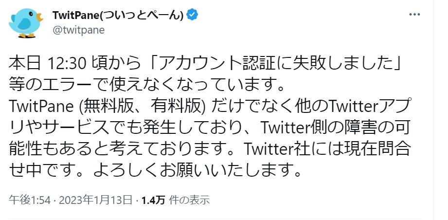 1月13日のお昼頃から、複数のTwitter(ツイッター)サードーパーティ製クライアントが認証エラーとなり、ツイートの読み込みやツイートが行えない現象が発生している。
