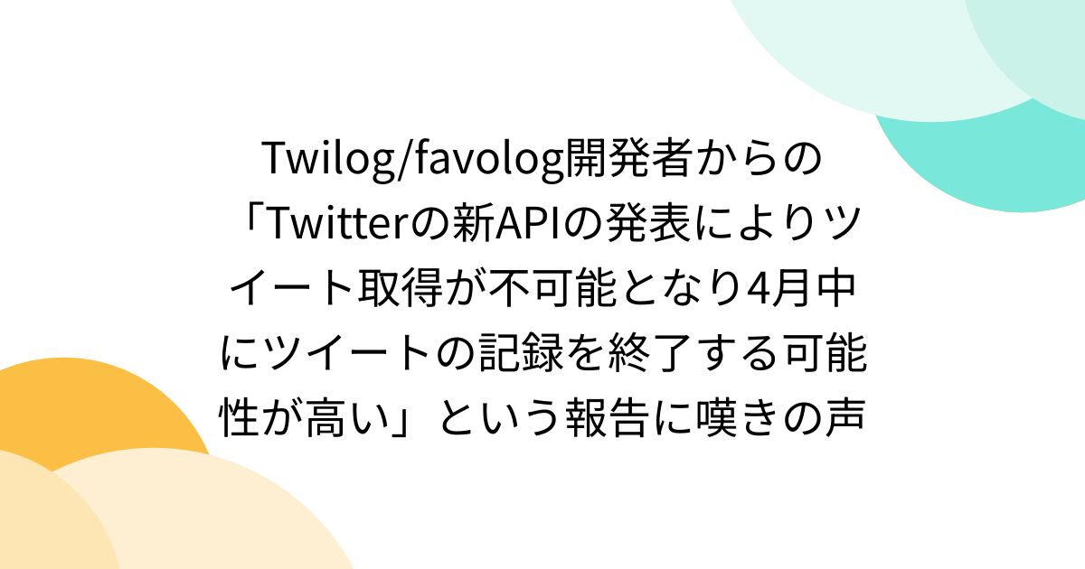 - Twilog/favolog開発者からの「Twitterの新APIの発表によりツイート取得が不可能となり4月中にツイートの記録を終了する可能性が高い」という報告に嘆きの声