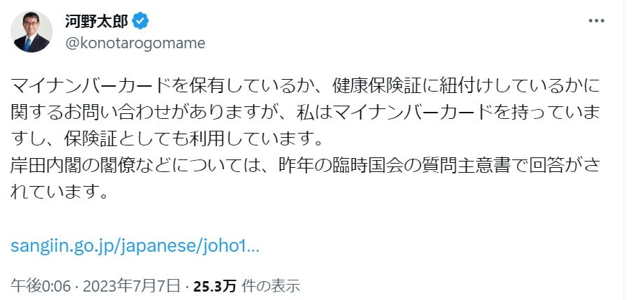 河野太郎デジタル大臣は、自身のTwitterアカウント(@konotarogomame)で「私はマイナンバーカードを持ってますし、保険証としても利用しています」と投稿した。