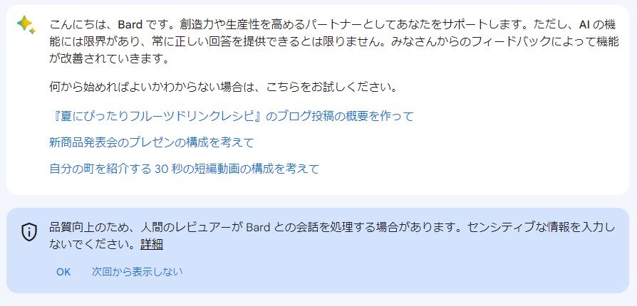 GoogleのAI「Bard」の初期画面に、「人間のレビュアーがBardとの会話を処理する場合があります」と明示。ユーザーの位置情報も利用中常に取得されるようになった。