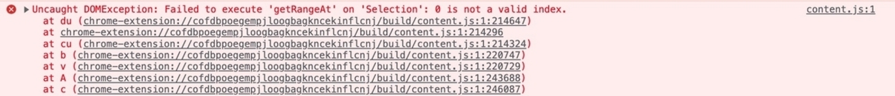背景 最近GitHubでページ内検索を使ってると、たまに次のような表示崩れが発生します。 スクロールしても前のコードがずっとそこに残っています。 このときのコンソールログとしては決まって次のエラーで、 content.js:1 Uncaught DOMException: Failed to execute 'getRangeAt' on 'Selection': 0 is not a valid index. at du (chrome-extension://cofdbpoegempjloogbagkncekinflcnj/build/content.js:1:214647) cofdbp…