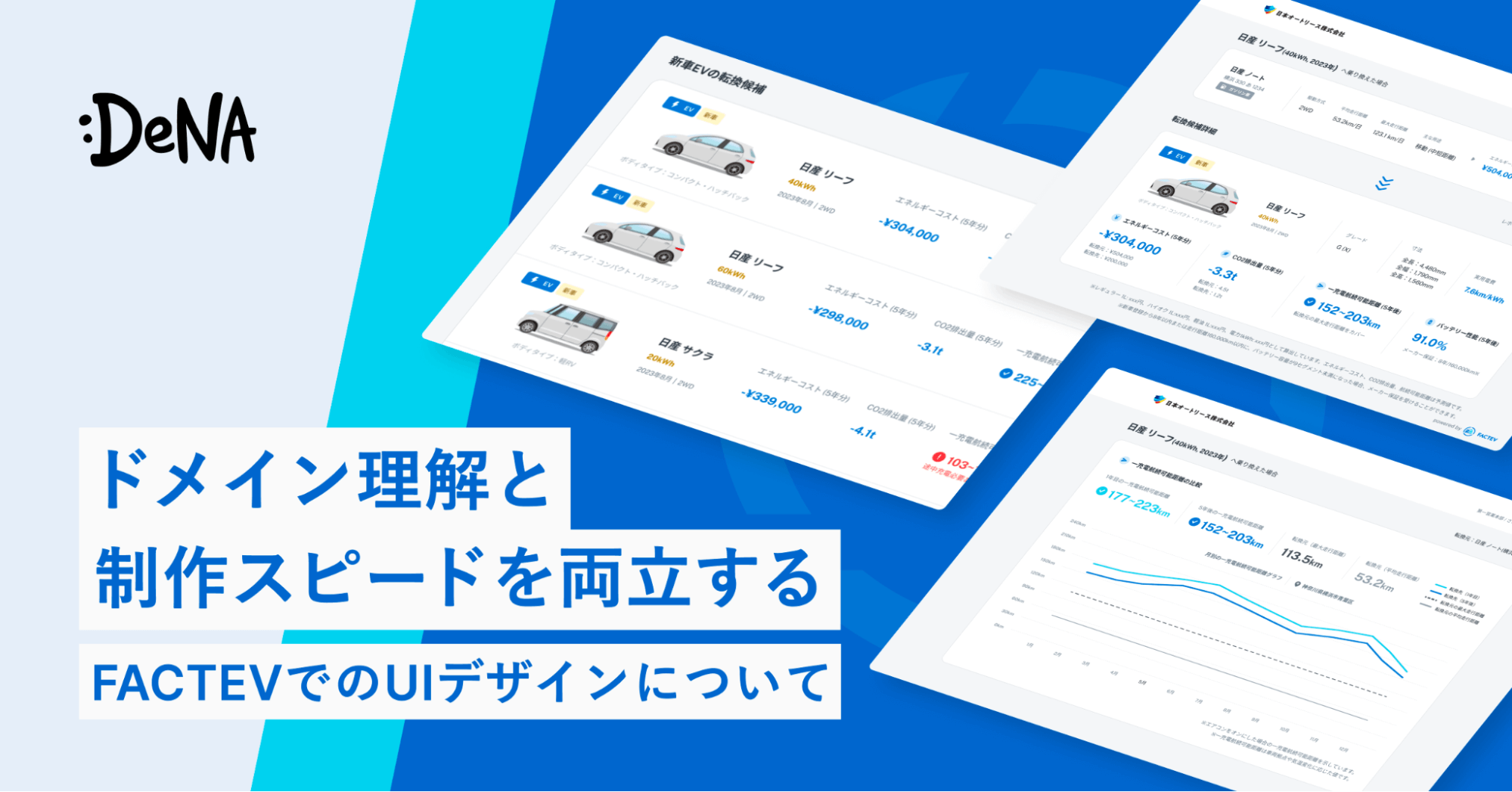 2023年4月にリリースされた、EV(電気自動車)の実用航続可能距離やバッテリーの性能、EVの導入効果予測を見える化するEV転換シミュレータ「FACTEV(ファクティブ)」のUIデザインを担当しました。