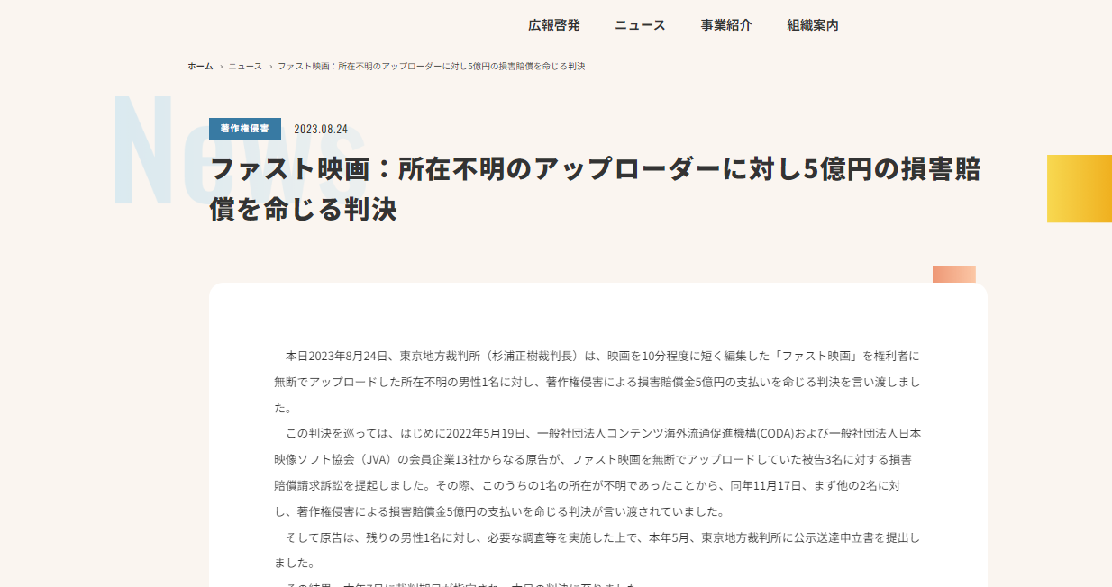 - “ファスト映画”訴訟で、所在不明になっていた1人に5億円の損害賠償命令