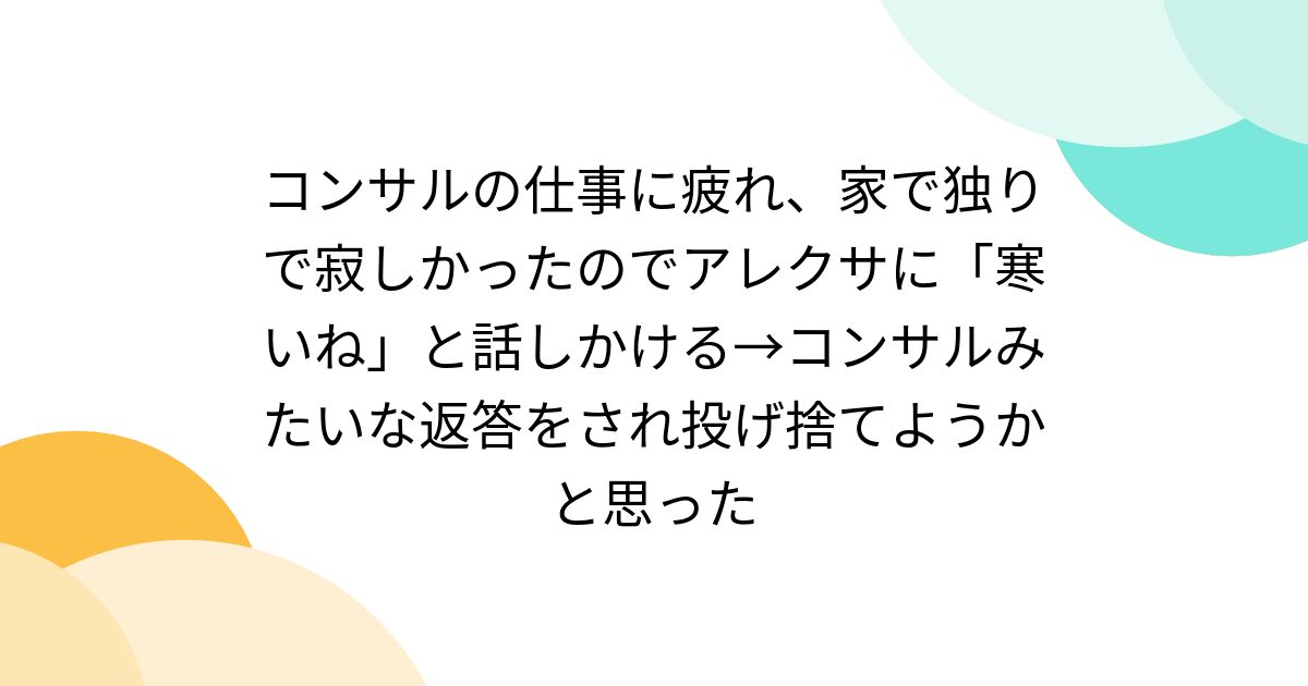 - コンサルの仕事に疲れ、家で独りで寂しかったのでアレクサに「寒いね」と話しかける→コンサルみたいな返答をされ投げ捨てようかと思った