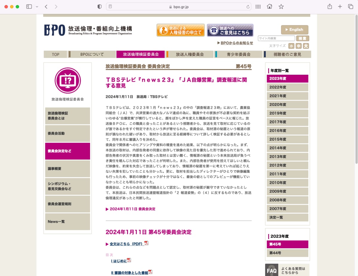 - TBS「news23」に放送倫理違反 BPO「映像の見た目を優先した」 JA共済“自爆営業”報道で