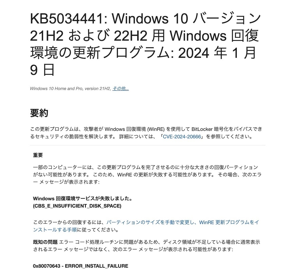 Microsoftは1月9日(現地時間)に月例アップデートとして更新プログラム「KB5034441」をリリースしたが、11日時点で、複数のユーザーからこの更新プログラムのインストールがエラーにより失敗するという現象が報告されている。この問題が発生した場合、Windows Updateの画面にエラーコード「0x80070643」が表示され、アップデートを継続することができない。