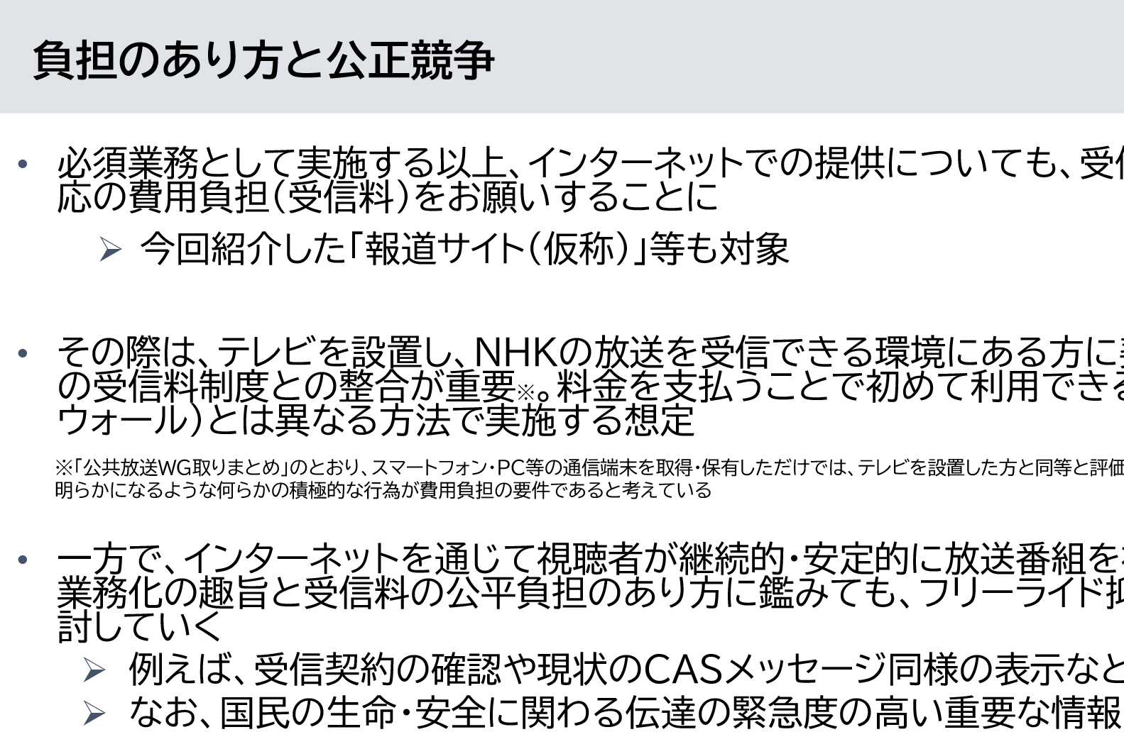 日本放送協会(NHK)は、総務省の会合において、将来NHKインターネットサービスの必須業務化が改正放送法で決まった場合の基本的な考え方を説明。負担のあり方について、「必須業務として実施する以上、インターネットでの提供についても、受信契約の対象として相応の費用負担(受信料)をお願いすることになる」との考えを示した。NHKプラスのような動画サービスだけでなく、NHK NEWS WEBなどの報道サイト等も対象となる。なお、テレビ受信料を支払っている場合は、追加の負担なくネットサービスを利用できる。