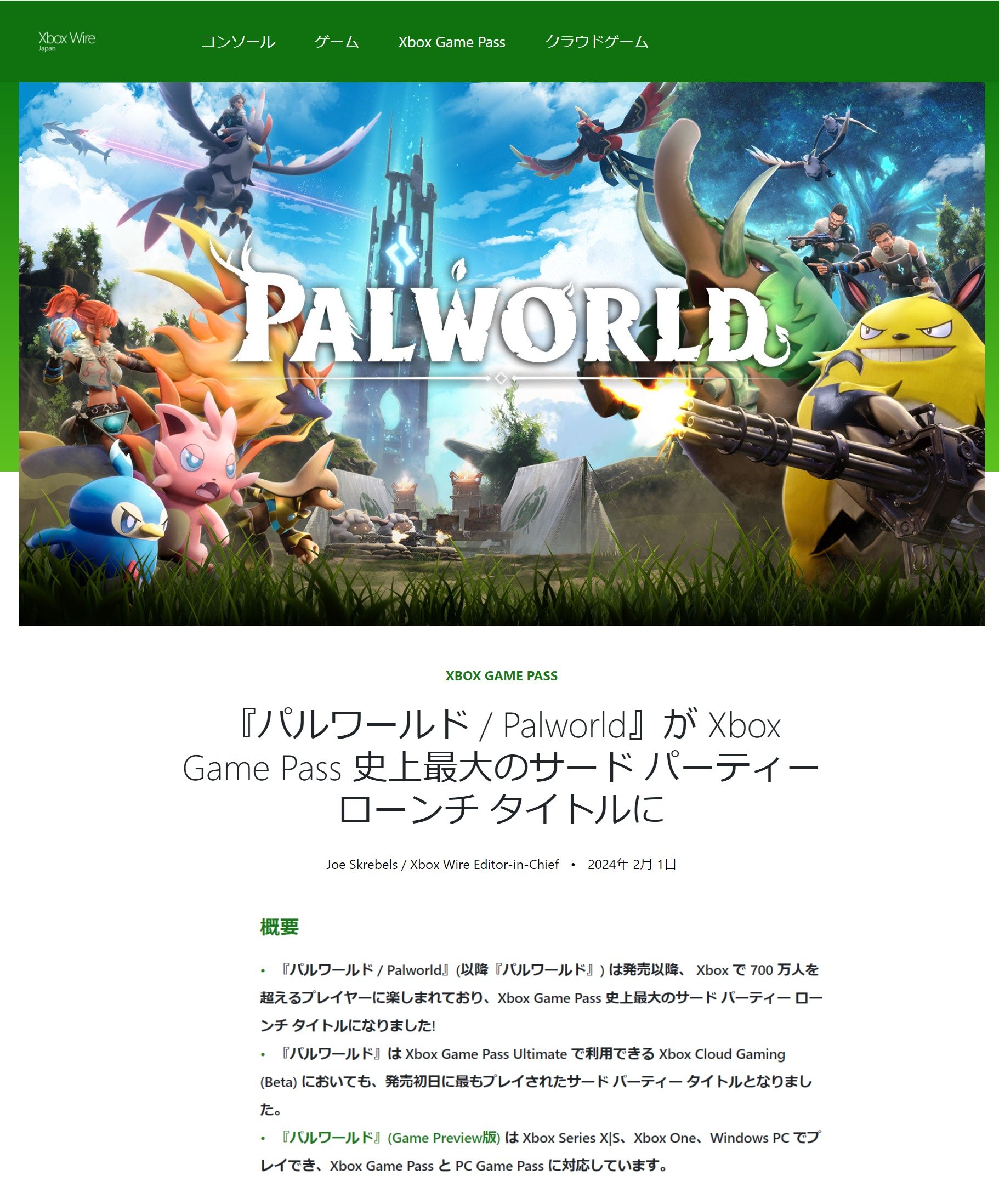 - Microsoft、パルワールドを支援 専用サーバなど提供 Game Pass版に1日最大300万近いプレーヤー