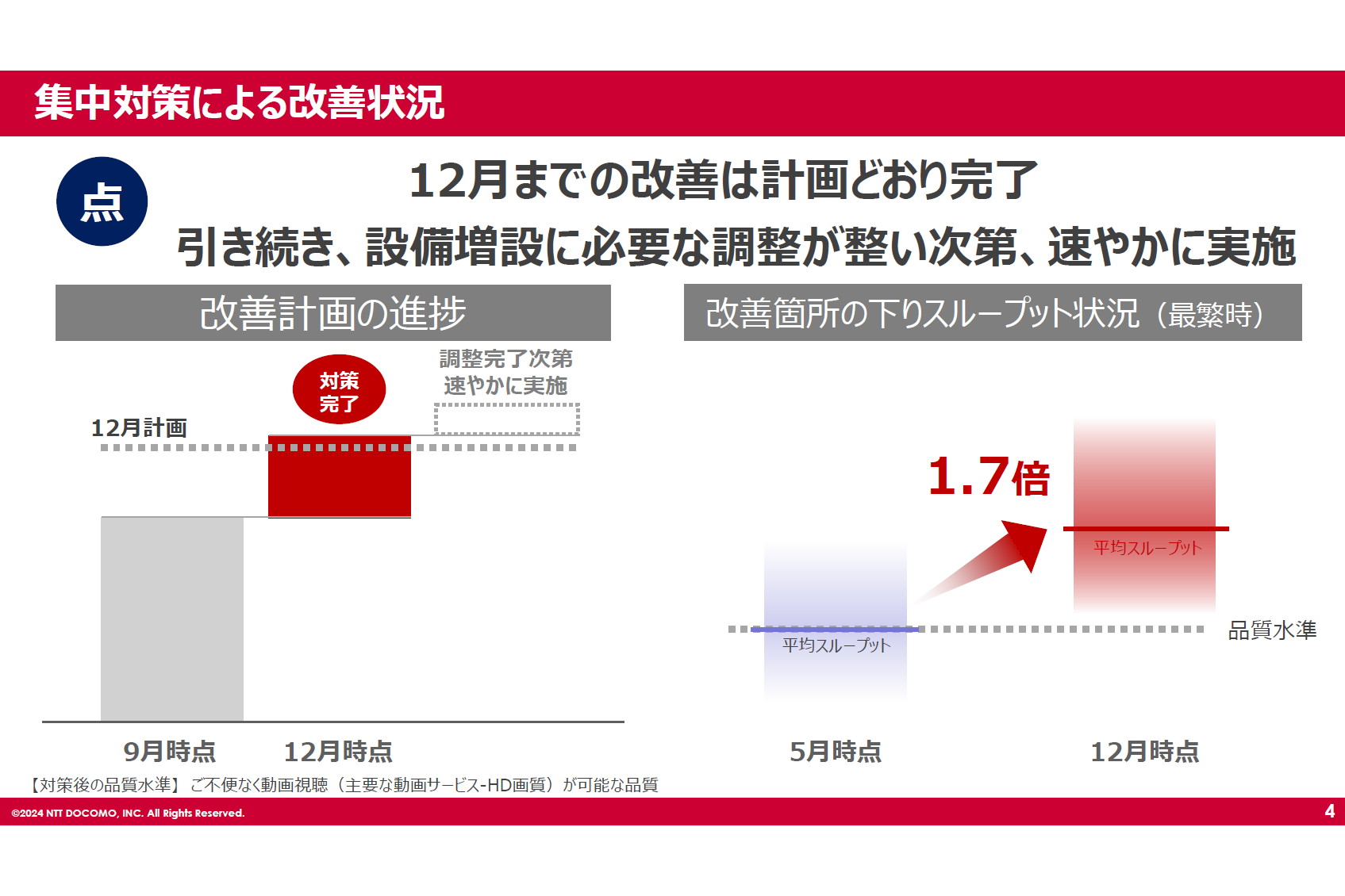 NTTドコモは、かねてより課題としてきた携帯電話サービスの通信品質について、予告していた2023年12月までの計画以上の予定を達成したと発表した。2日には改善をはかった場所での平均スループット(通信速度)が約半年前の1.7倍に達した。