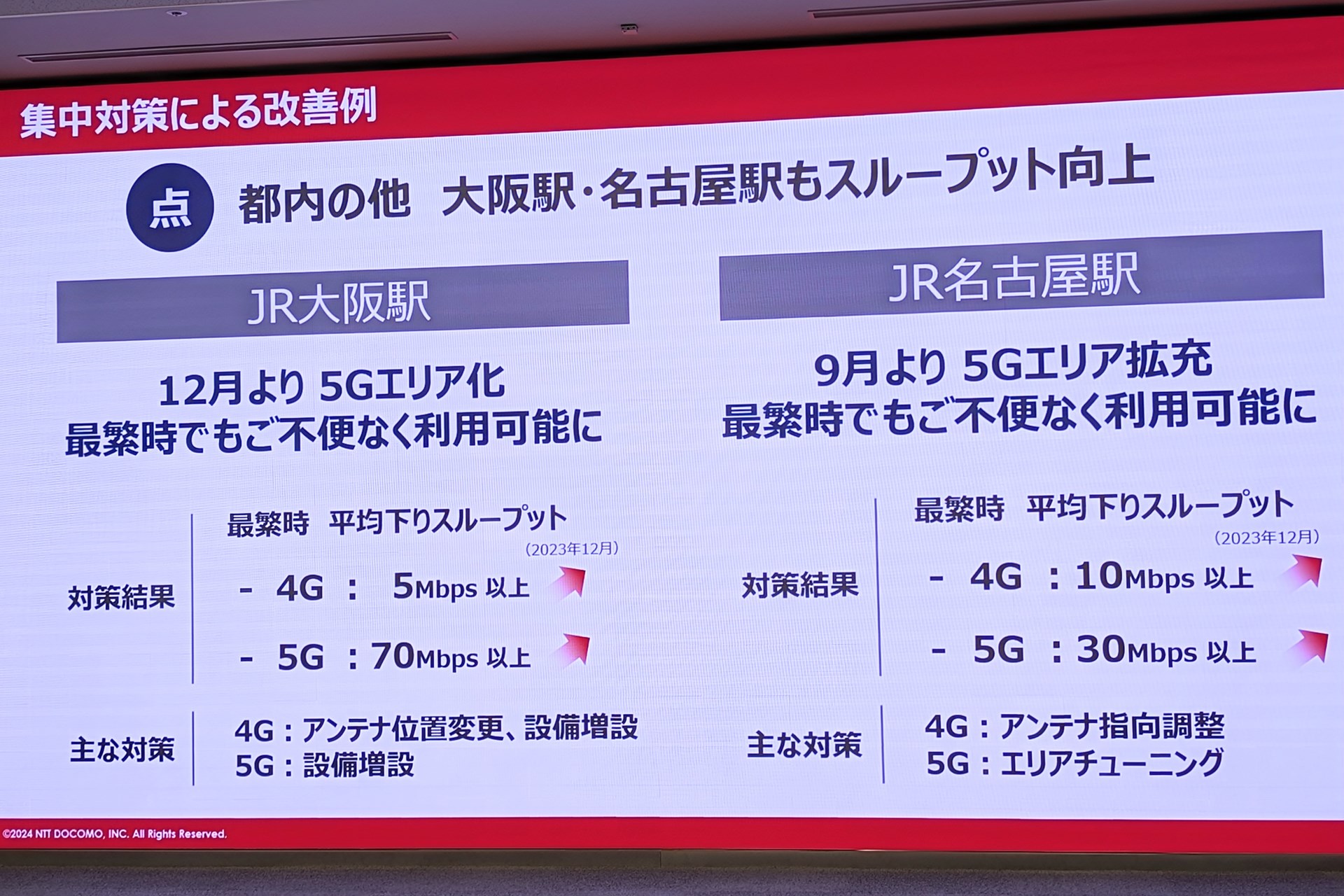 NTTドコモは、通信サービス品質の改善に関する説明会を開催し、2023年12月までの集中対策により「通信サービス品質が大きく改善した」と報告した。