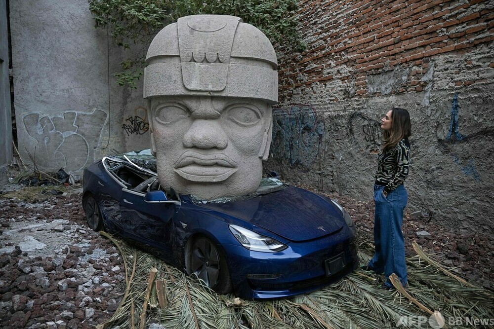 【3月15日 AFP】米電気自動車(EV)大手テスラ(Tesla)の車が、先住民の彫刻のような巨石頭に押しつぶされている──事故現場ではなく、テスラのイーロン・マスク(Elon Musk)最高経営責任者(CEO)を挑発したかったというメキシコ人アーティストの作品だ。
