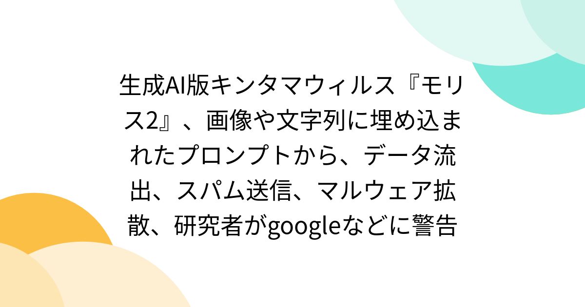- 生成AI版キンタマウィルス『モリス2』、画像や文字列に埋め込まれたプロンプトから、データ流出、スパム送信、マルウェア拡散、研究者がgoogleなどに警告