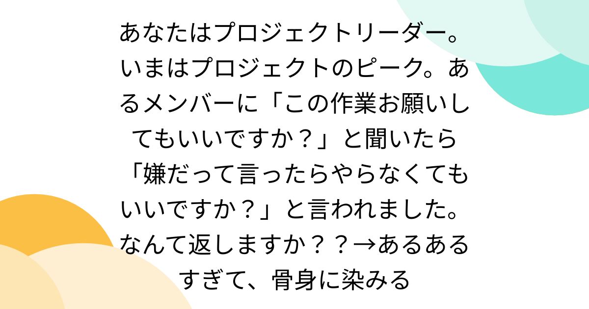 あなたはプロジェクトリーダー。いまはプロジェクトのピーク。あるメンバーに「この作業お願いしてもいいですか?」と聞いたら「嫌だって言ったらやらなくてもいいですか?」と言われました。なんて返しますか??→あるあるすぎて、骨身に染みる