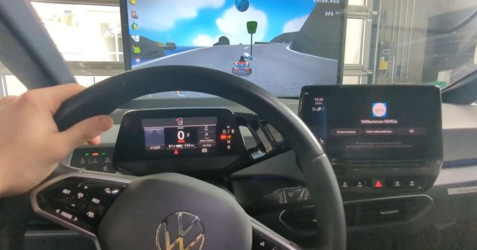 電気自動車をゲームコントローラーに魔改造 プレイ中に車が動かないように注意 フォルクスワーゲンで実証