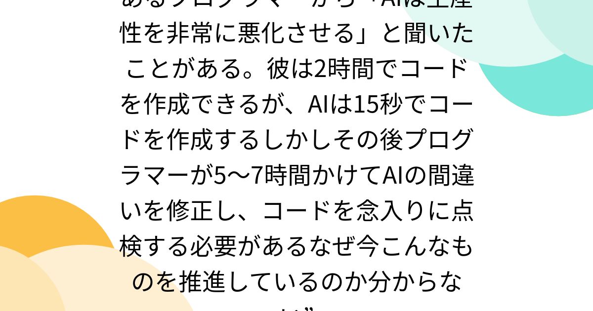 あるプログラマーから「AIは生産性を非常に悪化させる」と聞いたことがある。彼は2時間でコードを作成できるが、AIは15秒でコードを作成するしかしその後プログラマーが5~7時間かけてAIの間違いを修正し、コードを念入りに点検する必要があるなぜ今こんなものを推進しているのか分からない”