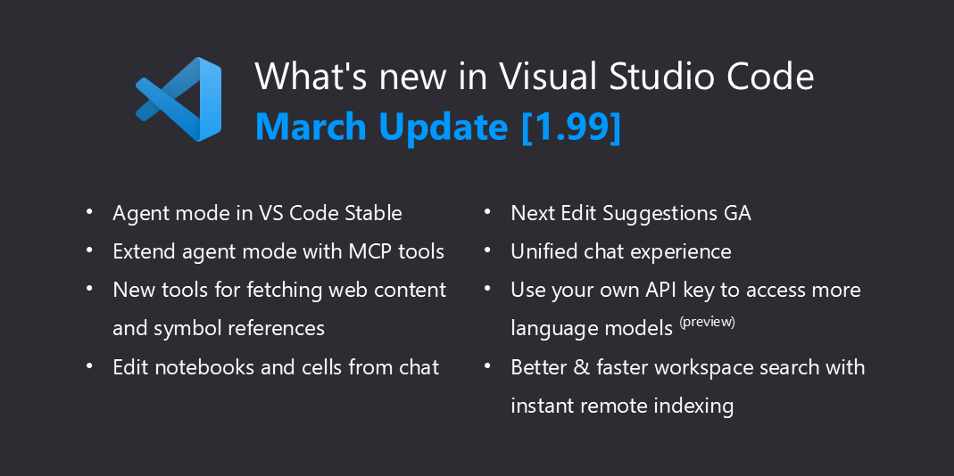 Learn what is new in the Visual Studio Code March 2025 Release (1.99)