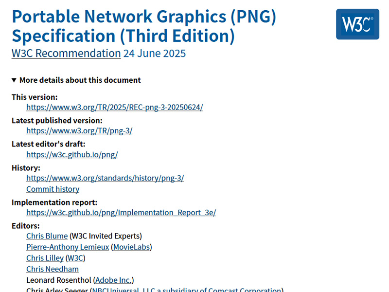 PNG Working Groupは24日、PNG(Portable Network Graphics)仕様の第3版をW3C勧告として公開した。第2版のW3C勧告は2003年11月で、約22年ぶりとなる。