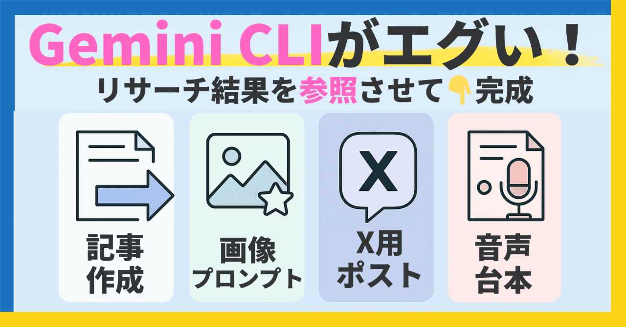 この記事は、以下のニュースレターで紹介している、Gemini CLIで「Deep Research用プロンプト→記事執筆→画像生成プロンプト→SNS文→音声台本を生成する9段階プロンプト」を実行した流れと生成コンテンツの紹介です。