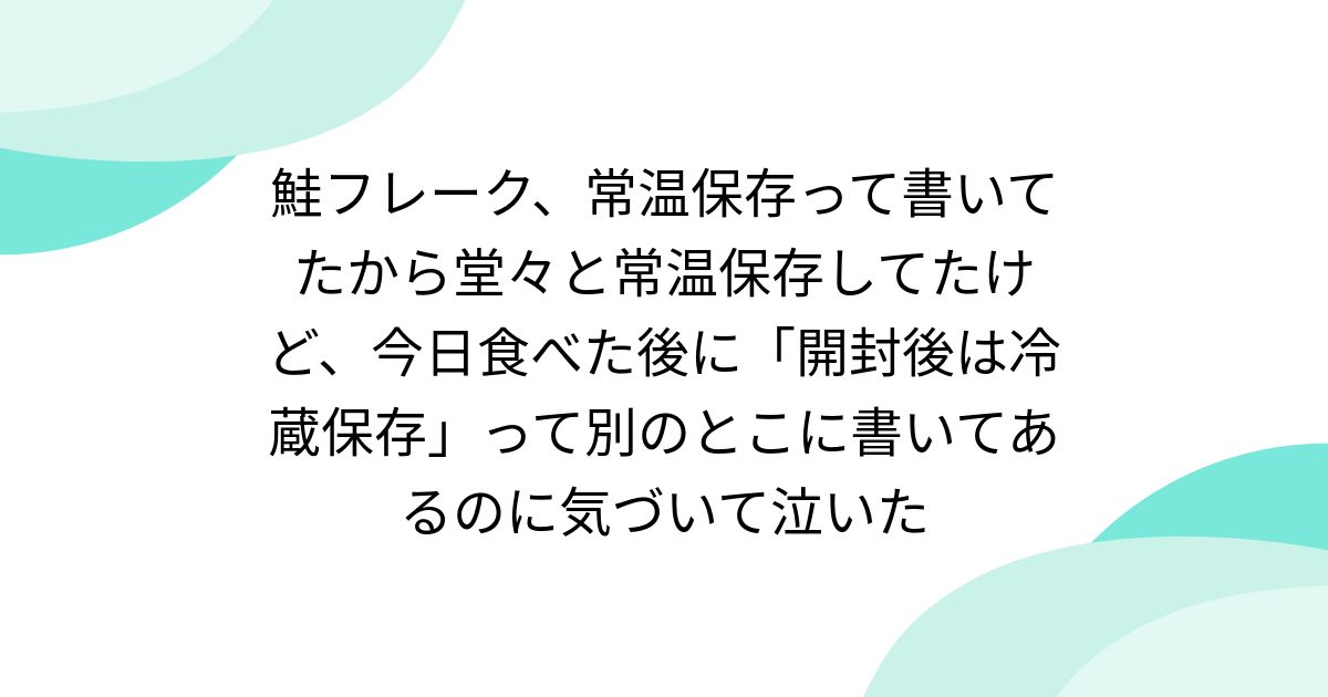 鮭フレーク、常温保存って書いてたから堂々と常温保存してたけど、今日食べた後に「開封後は冷蔵保存」って別のとこに書いてあるのに気づいて泣いた