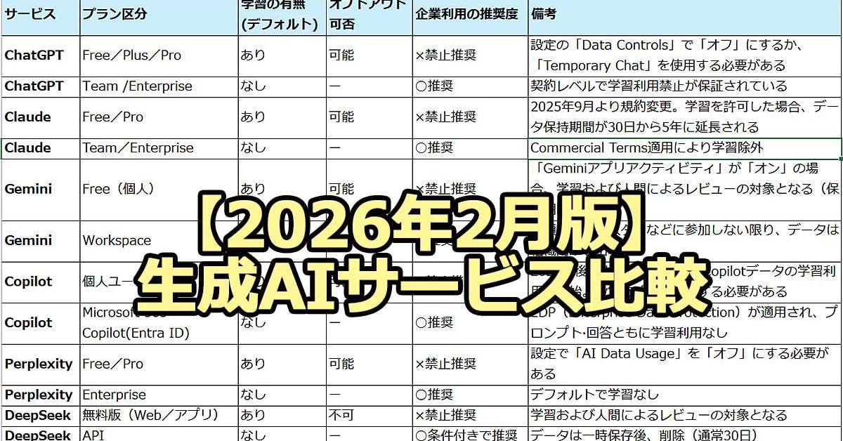 30. 【2026年2月版】生成AI 6大サービス比較:企業を情報漏えいから守るための管理者ガイド