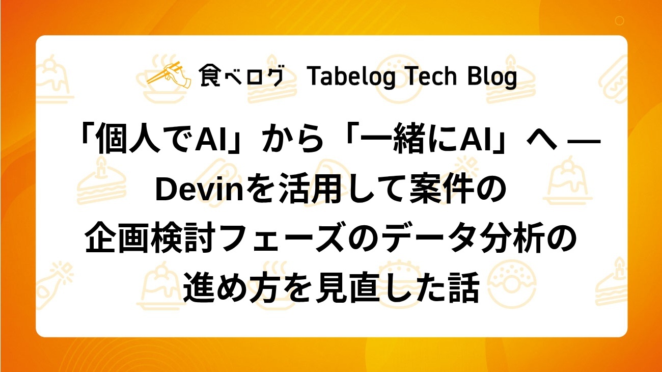こんにちは。食べログカンパニー 開発本部 国内メディア開発部 店舗情報チームの高橋です。 本記事では、案件の企画検討フェーズにおけるデータ分析の進め方を、AIコーディングエージェントのDevinを活用して見直した取り組みを紹介します。企画メンバー(PdM)とエンジニアが個別にAIを使う状態から、Devinを介して共同でデータ分析に取り組む進め方へ変えました。その結果、工数は約3人日から約1.6人日へ、リードタイムは2〜3日から1日へ短縮できました。 この変化の出発点にあったのは、企画検討フェーズでよくある進め方への疑問でした。「エンジニアがデータを取得し、企画メンバーが分析する」という分業スタ…