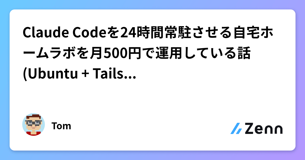 - Claude Codeを24時間常駐させる自宅ホームラボを月500円で運用している話(Ubuntu + Tailscale + tmux)