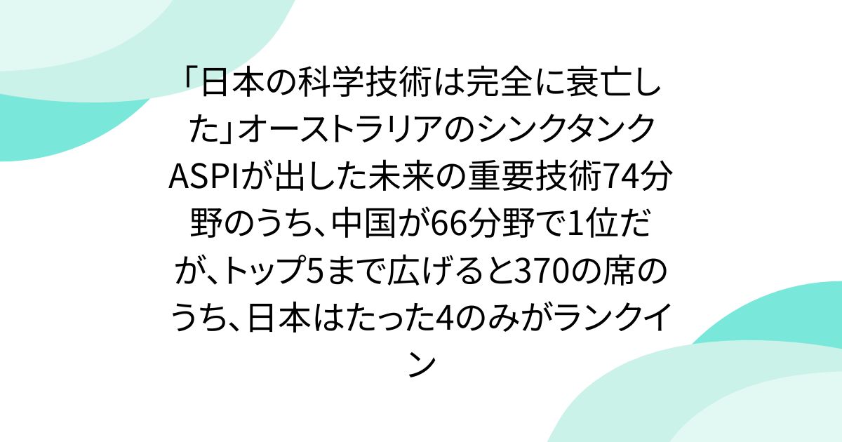 - 「日本の科学技術は完全に衰亡した」オーストラリアのシンクタンクASPIが出した未来の重要技術74分野のうち、中国が66分野で1位だが、トップ5まで広げると370の席のうち、日本はたった4のみがランクイン