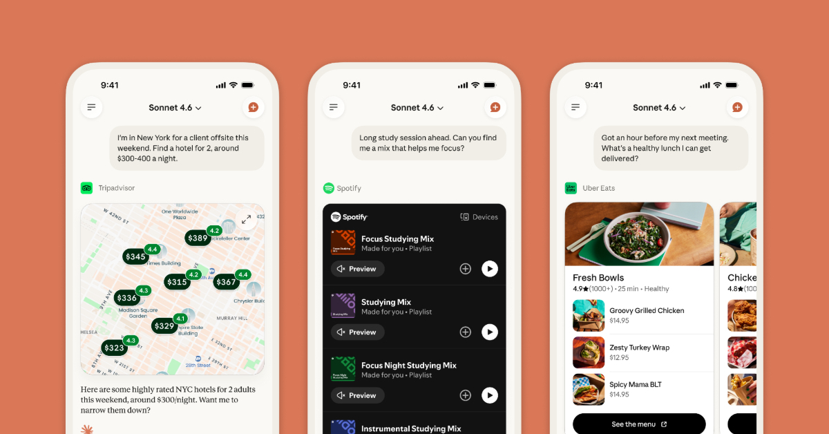 Anthropicは、「Claude」の外部連携機能「コネクタ」を拡充した。Uber EatsやSpotify、Booking.comなど日常的なサービスに対応。会話の文脈から最適なアプリを動的に提案し、Claudeで予約や検索を行える。全プランのユーザーが利用可能だ。