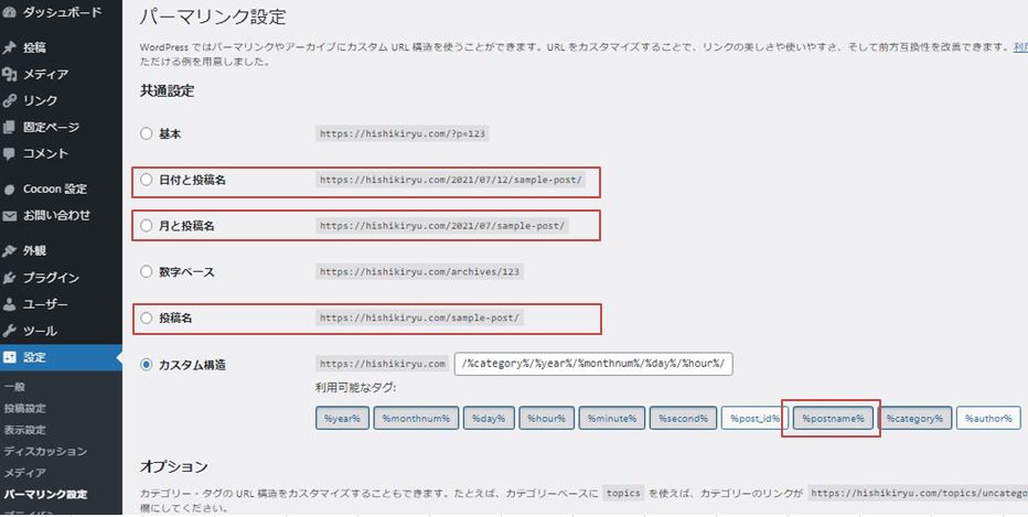 投稿名が出るものに設定すると後でパーマリンクを編集できるようになります。